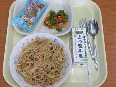 この日の献立は、和風スパゲティ、アスパラガスのサラダ、